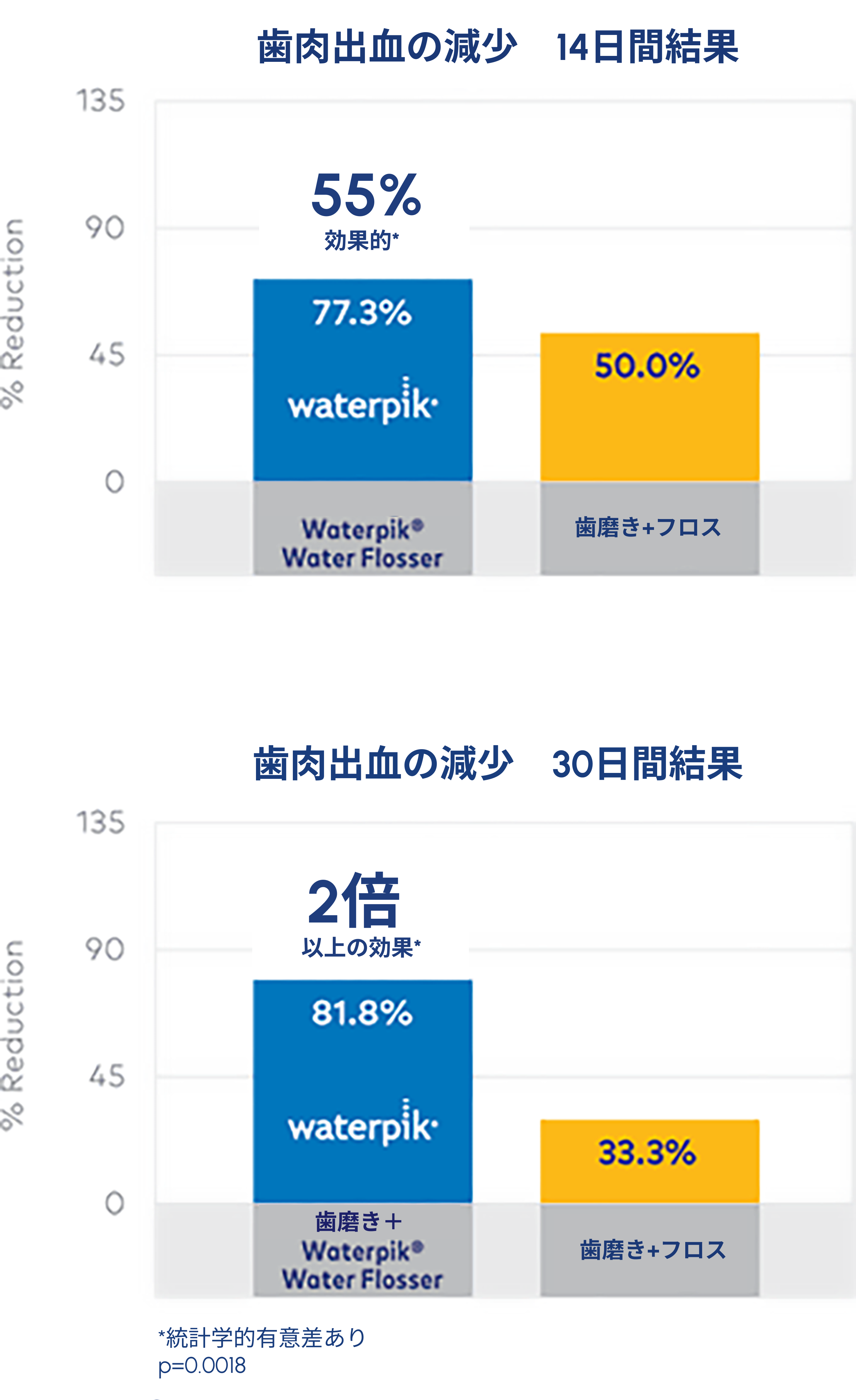 • ウォーターフロッサーグループは、糸フロスグループに比べ、145%優れた歯茎出血の減少を達成(p=0.0018)。