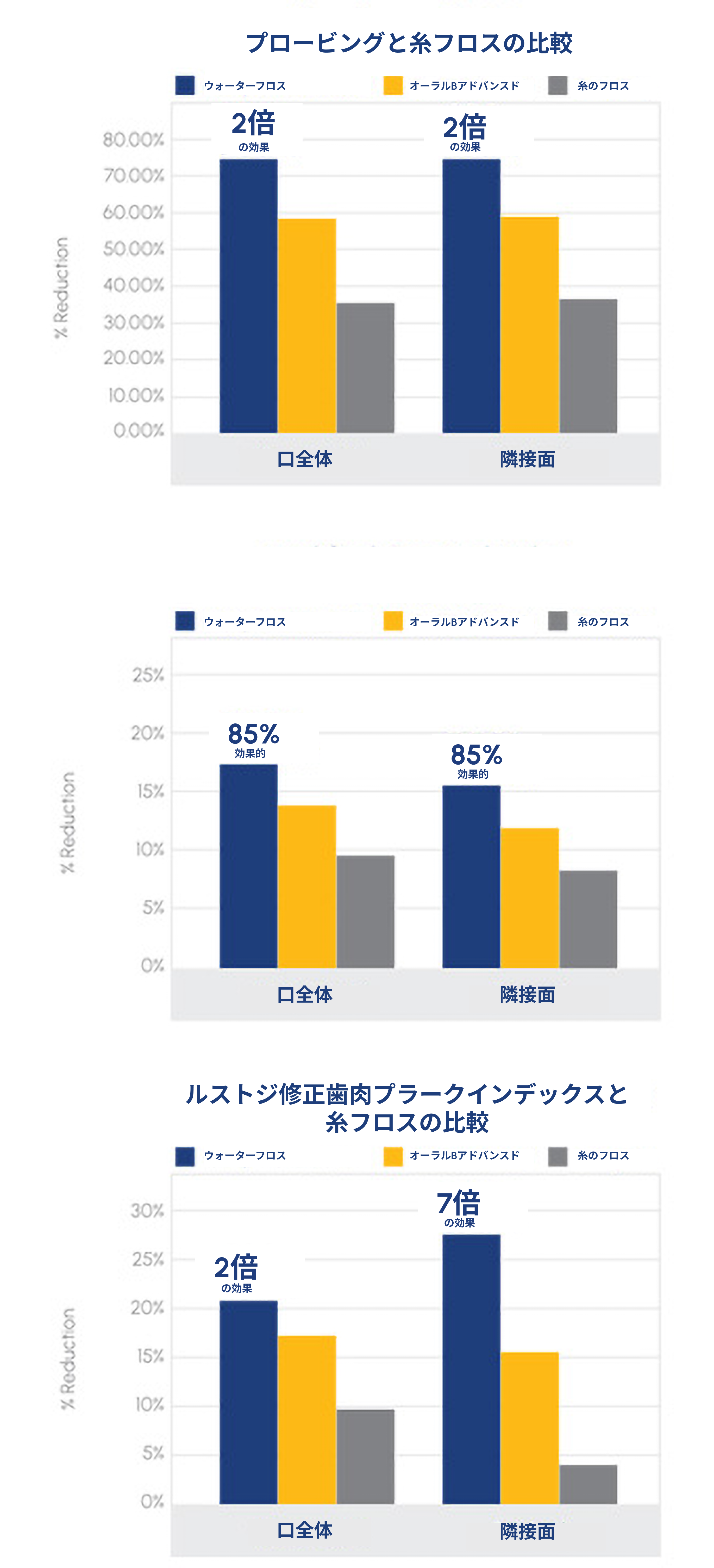 研究開始から4週間後において、Waterpik™IONウォーターフロッサーは、オーラルB® アドバンスドウォーターフロッサーまたは糸フロスと比較して、歯垢除去と炎症軽減により効果的でした。オーラルB® アドバンスドと比較して、Waterpik™ウォーターフロスは口腔全体のスコアにおいて、出血減少で26%、歯肉炎減少で26%、歯垢除去で22%より効果的でした。従来のフロスと比較して、IONは口腔全体の出血減少と歯垢除去において最大2倍の効果を示し、歯肉炎減少では85%より効果的でした。隣接面部位では、IONは糸フロスと比較して、歯垢除去で最大7倍、出血減少で最大2倍、歯肉炎減少で90%より効果的でした。