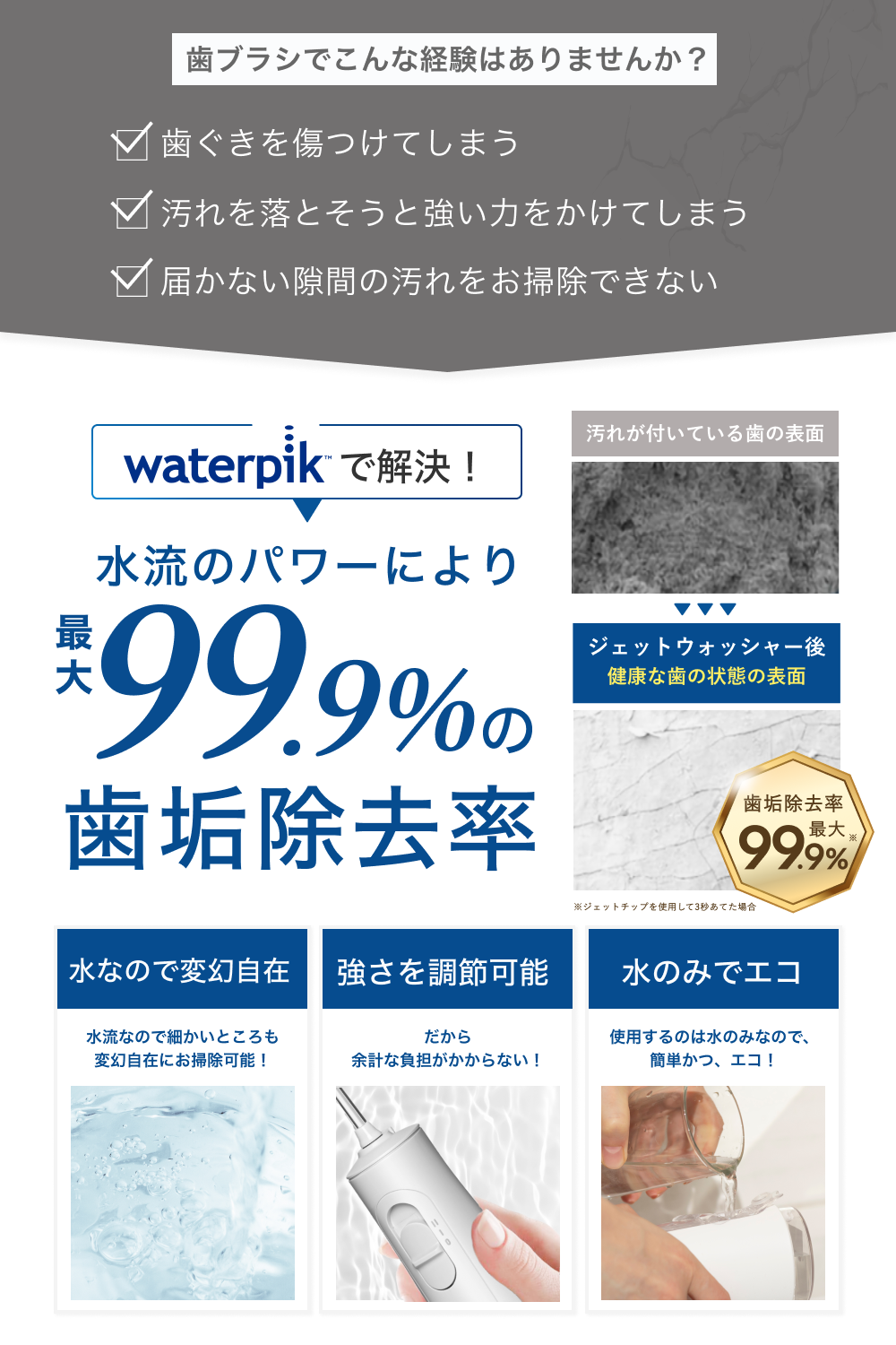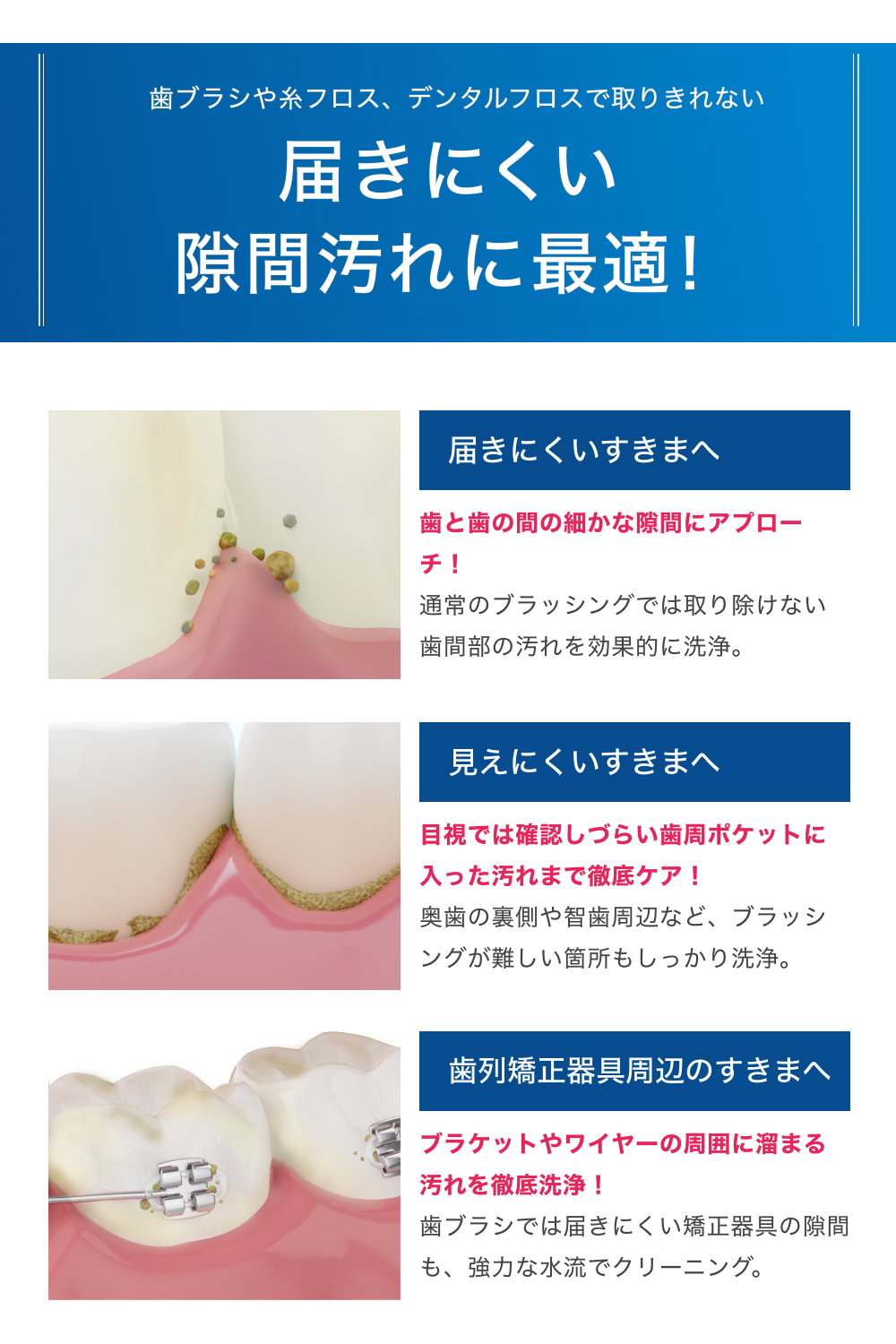 磨き残しが発生しやすい歯間の汚れも、歯周ポケットの汚れも1台でケア。しかも手軽でストレスフリー。独自のジェット水流で、奥に詰まった小さな汚れまでパワフルに除去します。