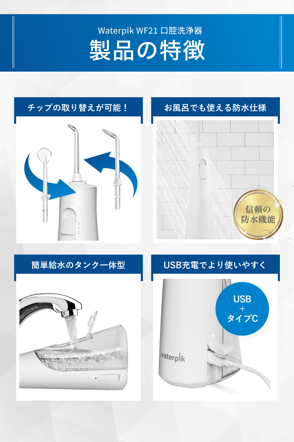 4時間の充電で約4週間使える便利な充電式の ウォーターフロス 。USB-Cにも対応しているので、場所を選ばず充電できます。